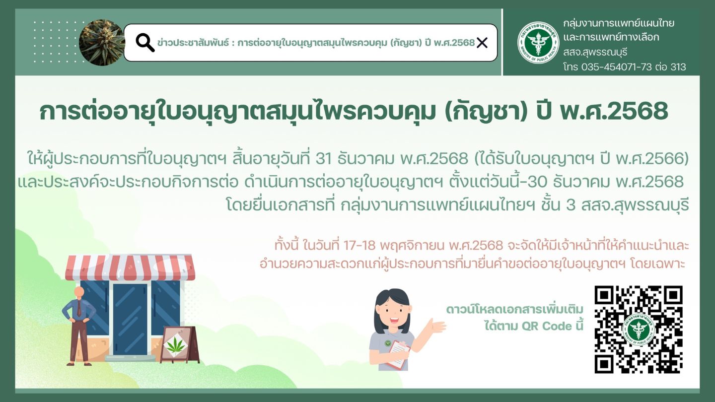 📣ประชาสัมพันธ์การต่ออายุใบอนุญาตสมุนไพรควบคุม (กัญชา) ปี พ.ศ. 2568 สำหรับผู้ประกอบการที่ได้รับใบอนุญาตเมื่อปี พ.ศ. 2566 และใบอนุญาตจะสิ้นอายุในวันที่ 31 ธันวาคม พ.ศ. 2568 หากประสงค์จะประกอบกิจการต่อ ขอให้ดำเนินการยื่นคำขอต่ออายุใบอนุญาตสมุนไพรควบคุม (กัญชา) ได้ที่ 📍 กลุ่มงานการแพทย์แผนไทยฯ ชั้น 3 สำนักงานสาธารณสุขจังหวัดสุพรรณบุรี